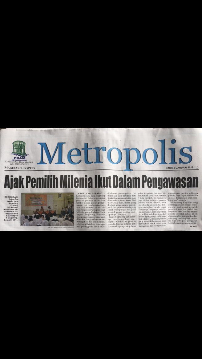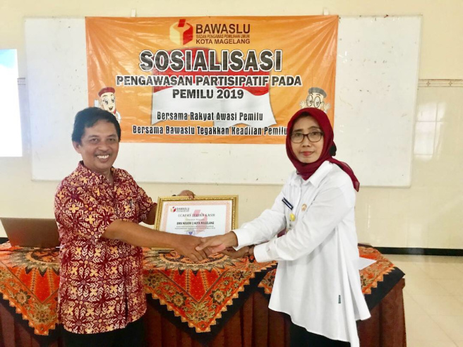 Bawaslu Kota Magelang Menyelenggarakan Sosialisasi Pengawasan Partisipatif Pada Pemilu 2019 bersama Siswa dan Siswi SMA Negeri 1 Magelang, di kota Magelang. Acara tersebut dilaksanakan di Aula SMA Negeri 1 Magelang dan diikuti oleh 294 siswa, pada Rabu 2 Desember 2018, Pukul 11.00 hingga 12.15 WIB.