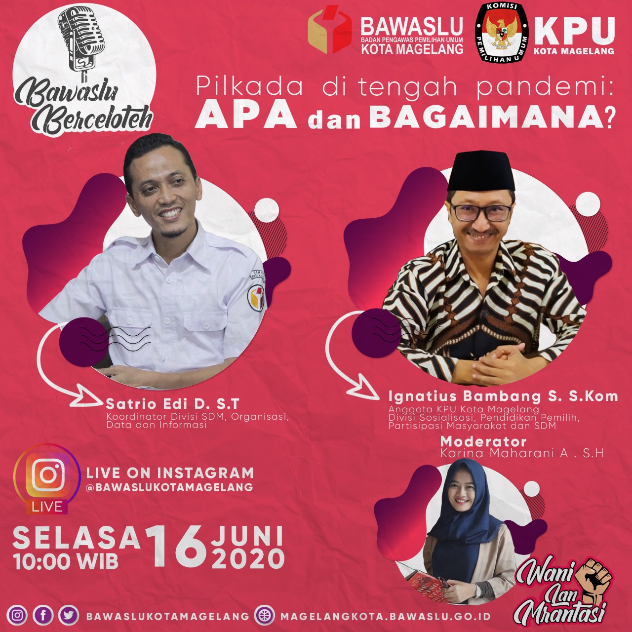 Hallo #sahabatbawaslu! BAWASLU BERCELOTEH akan hadir dalam LIVE INSTAGRAM dengan tema Pilkada di Tengah Pandemi: Apa dan Bagaimana?. Diskusi ini akan membahas mengenai kesiapan Bawaslu serta KPU dalam menghadapi Pilkada yang akan dilaksanakan di tengah pandemi Covid-19, dan bagaimana masyarakat dapat turut serta berperan dalam menyukseskan Pilkada. Simak pembahasannya bersama Anggota Bawaslu Kota Magelang selaku Koordinator Divisi SDM, Organisasi dan Data Informasi serta Anggota KPU Kota Magelang Divisi Sosialisasi, Pendidikan Pemilih, Partisipasi Masyarakat dan SDM.