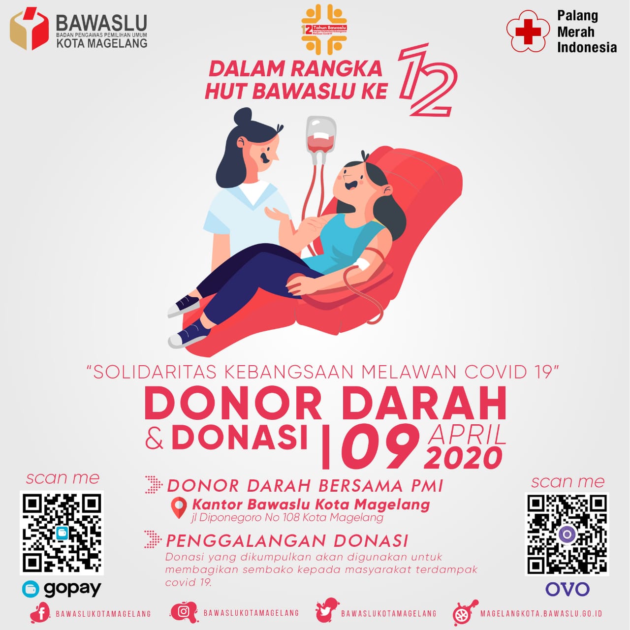 Dalam rangka HUT Bawaslu ke-12, Bawaslu Kota Magelang mengadakan kegiatan bertema "Solidaritas Kebangsaan Melawan Covid-19" dengan melakukan aksi DONOR DARAH & DONASI yang akan dilaksanakan pada hari Kamis 9 April 2020 di lingkungan Bawaslu Kota Magelang Jl. P. Diponegoro No. 108 Magelang. Partisipasi #sahabatbawaslu dalam aksi DONASI ini tentu sangat kami harapkan untuk membantu masyarakat terdampak Covid-19 yang kami wujudkan berupa sembako. DONASI dapat dilakukan dengan scan barcode yang tercantum untuk melakukan pembayaran dengan GOPAY dan OVO, serta dapat juga datang langsung ke kantor Bawaslu Kota Magelang. Jangan lupa tetap jaga kesehatan ya!