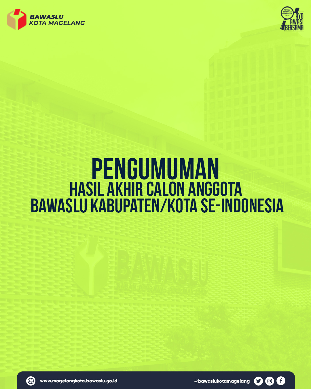 Pengumuman Hasil Akhir Calon Anggota Bawaslu Kabupaten/Kota Se-Indonesia Terpilih humas | Senin, Agustus 21, 2023 - 10:37 Info Selengkapnya: KLIK DISINI Tag Berita Share Berita Terkini humas Sabtu, Desember 6, 2025 - 09:09 Bawaslu Kota Magelang Gelar Penguatan Kelembagaan Jilid II, Teguhkan Peran Pengawas Pemilu Hadapi Disinformasi Digital humas Kamis, November 20, 2025 - 15:01 Mahasiswa Baru STMIK Bina Patria Dibekali Literasi Demokrasi oleh Bawaslu humas Kamis, November 20, 2025 - 14:27 Obrolan Santai, Bawaslu Kupas Pengawasan Partisipatif di Magelang FM Lihat Lainnya