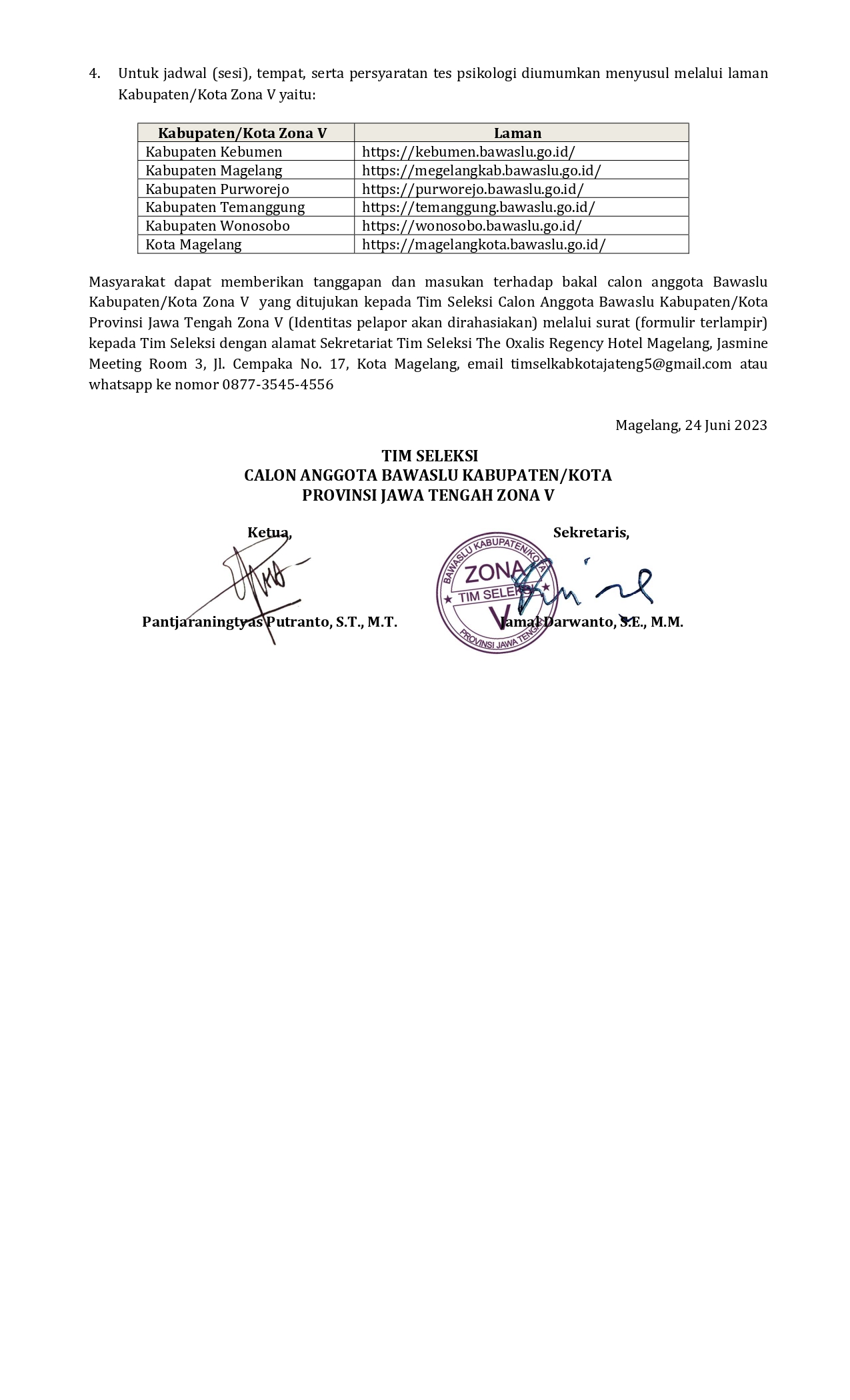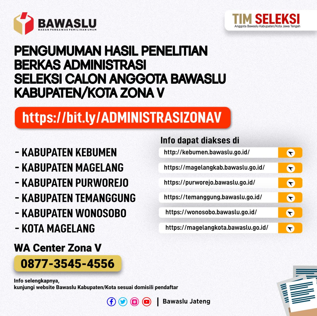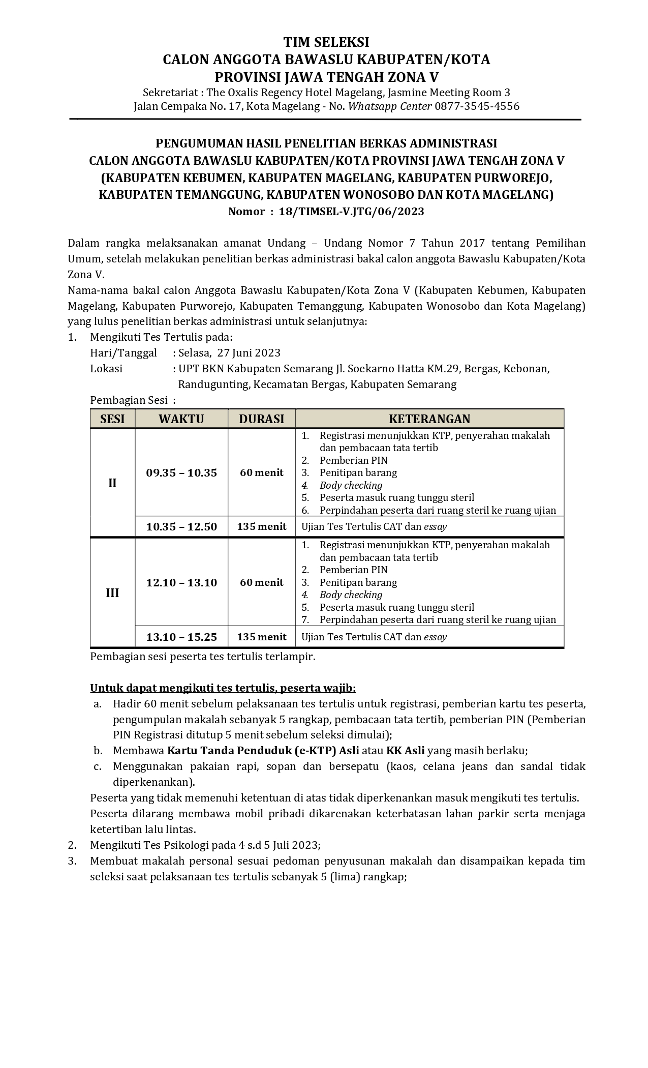 PENGUMUMAN HASIL PENELITIAN BERKAS ADMINISTRASI CALON ANGGOTA BAWASLU KABUPATEN/KOTA PROVINSI JAWA TENGAH ZONA V (KABUPATEN KEBUMEN, KABUPATEN MAGELANG, KABUPATEN PURWOREJO, KABUPATEN TEMANGGUNG, KABUPATEN WONOSOBO DAN KOTA MAGELANG) Nomor : 18/TIMSEL-V.JTG/06/2023 Dalam rangka melaksanakan amanat Undang – Undang Nomor 7 Tahun 2017 tentang Pemilihan Umum, setelah melakukan penelitian berkas administrasi bakal calon anggota Bawaslu Kabupaten/Kota Zona V. Nama-nama bakal calon Anggota Bawaslu Kabupaten/Kota Zona V (Kabupaten Kebumen, Kabupaten Magelang, Kabupaten Purworejo, Kabupaten Temanggung, Kabupaten Wonosobo dan Kota Magelang) yang lulus penelitian berkas administrasi untuk selanjutnya: