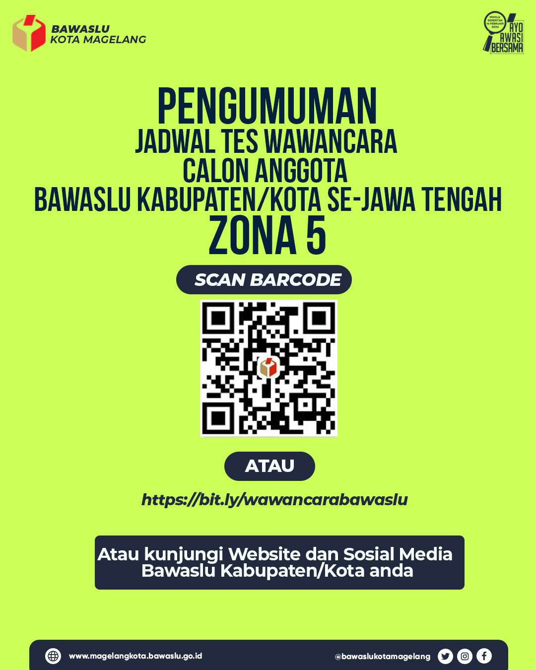 Dalam rangka melaksanakan amanat Undang–Undang Nomor 7 Tahun 2017 tentang Pemilihan Umum, setelah melakukan penilaian atas Tes Tertulis dan Tes Psikologi Calon Anggota Bawaslu Kabupaten Kebumen, Kabupaten Magelang, Kabupaten Purworejo, Kabupaten Temanggung, Kabupaten Wonosobo, Kota Magelang. bersama ini kami umumkan jadwal Tes Wawancara Calon Anggota Bawaslu Kabupaten/Kota terlampir.