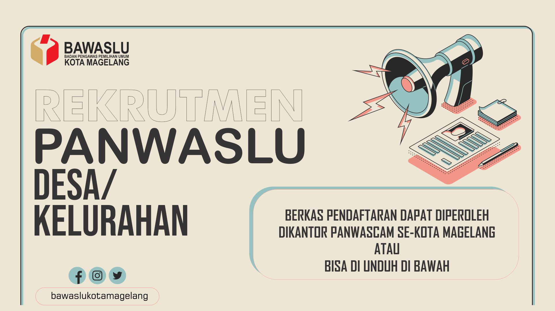 - Formulir Pendaftaran Panwascam Kota Magelang bisa di unduh disini : /sites/magelangkota/files/uploads/2020/02/BERKAS-PENDAFTARAN-PPL.pdf