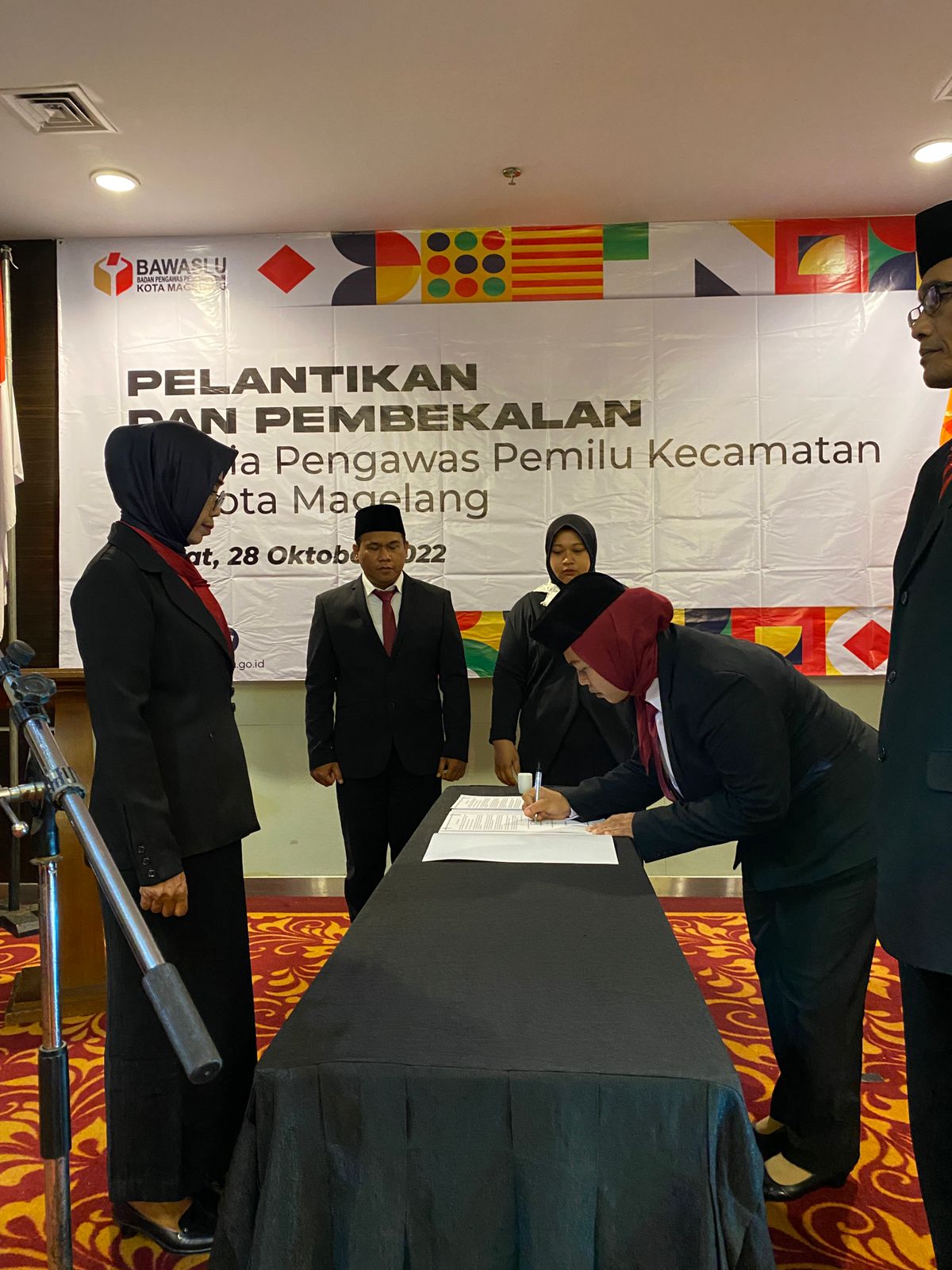 Kota Magelang - Jumat 28 Oktober 2022, bertempat di Hotel Atria Magelang, Bawaslu Kota Magelang melantik 9 orang Panwaslu Kecamatan, setelah melalui 3 tahapan seleksi yaitu administrasi, CAT dan wawancara. Pelantikan Panwaslu Kecamatan ini dihadiri oleh Ketua DPRD Kota Magelang, Perwakilan dari Dandim 0705, Kapolres, Ketua KPU dan Forkompimcam. Pelantikan dan pengambilan sumpah dan janji dipimpin langsung oleh Ketua Bawaslu Kota Magelang, Endang Sri Rahayu A, SE