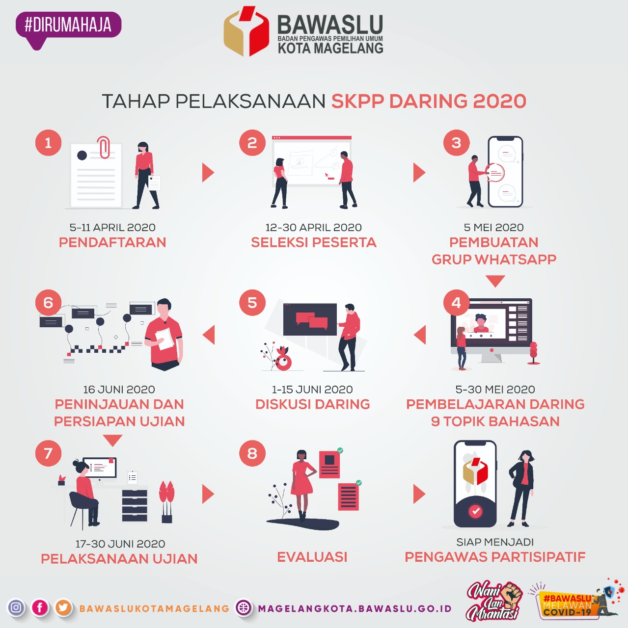 Tahapan SKPP Daring 2020 humas | Kamis, April 30, 2020 - 12:55 Tahukah kamu bagaimana tahapan pelaksanaan SKPP Daring 2020? Yuk simak infografisnya! Tag Berita Share Berita Terkini humas Sabtu, Desember 6, 2025 - 09:09 Bawaslu Kota Magelang Gelar Penguatan Kelembagaan Jilid II, Teguhkan Peran Pengawas Pemilu Hadapi Disinformasi Digital humas Kamis, November 20, 2025 - 15:01 Mahasiswa Baru STMIK Bina Patria Dibekali Literasi Demokrasi oleh Bawaslu humas Kamis, November 20, 2025 - 14:27 Obrolan Santai, Bawaslu Kupas Pengawasan Partisipatif di Magelang FM Lihat Lainnya