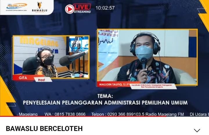 Kota Magelang - Kamis 20 Januari 2022, pukul 10.00 WIB, Bawaslu Kota Magelang Melaksanakan Talkshow Live Streaming "Bawaslu Berceloteh" bersama Radio Magelang FM dengan tema "Penanganan Pelanggaran Administrasi Pada Pemilu". Talkshow tersebut merupakan salah satu program sosialisasi Bawaslu Kota Magelang kepada masyarakat yang berlangsung setiap bulan di Radio Magelang FM dan juga ditayangkan secara streaming di Youtube Bawaslu Kota Magelang.